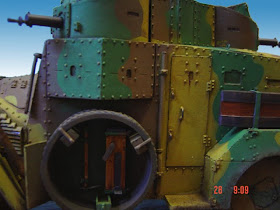 Après une sous-couche de gris carrosserie en bombe pour unifier les teintes et permettre à la peinture de mieux accrocher, une couche de jaune moutarde est appliquée sur tout le véhicule. On badigeonne ensuite du maskol à l’endroit où l’on veut conserver le jaune (selon un schéma ondulé à bords francs), puis on passe uniformément une couche de vert, on badigeonne du maskol là où l’on veut conserver le vert, puis on passe une couche uniforme de brun; Une fois toutes ces couches passées, il ne reste plus qu’à enlever le maskol pour obtenir le camouflage trois tons. L’important est de commencer par la tonalité la plus claire pour aller vers la plus foncée. Le plus important à mon sens est de ne pas oublier que visuellement les couleurs se mélangent les unes aux autres (un jaune à côté d’un vert paraîtra jaune vert, à côté d’un rouge paraîtra orange), il est donc capital de rajouter une pointe de vert et de brun au jaune, une pointe de jaune et de brun au vert, et une pointe de jaune et de vert au brun. Bien sûr, plus la couleur est foncée et moins on en rajoute et inversement. C’est ce qui permet une uniformité des tons tout en conservant la différence. Les bandages caoutchouc sont peints dans une teinte gris noir (avec une pointe de jaune). La patine commence avec plusieurs filtres de terre d’ombre brûlée puis un très léger drybrush avec la teinte de base éclaircie pour faire ressortir tous les rivets. Quelques coulures sont effectuées avec un pinceau triple zéro et de la peinture à l’huile terre d’ombre brûlée, les angles sont légèrement accrochés de façon irrégulière avec cette même peinture en gardant la main légère, enfin des pigments sienne naturelle et ombre naturelle sont appliqués et fixés à l’essence F.
