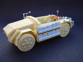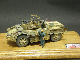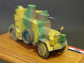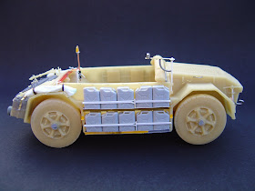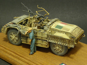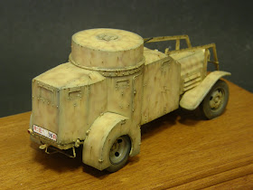 Le modèle reçoit une première couche d'apprêt carosserie gris clair puis un pré-ombrage dans un mélange de noir mat et marron foncé sur tous les creux et reliefs. La couleur de base est le classique tamiya désert sand éclairci de blanc mat et passé en couches très fines de façon à laisser transparaître le pré-ombrage. De fines bandes de red brown très diluées sont ensuite passées sous forme de vermicelles. Vient ensuite plusieurs filtres en terre d'ombre brulée et terre d'ombre naturelle, les angles du véhicule sont repiquées au pinceau et quelques pigments viennent compléter le vieillissement. La plaque d'immatriculation est réalisée à l'imprimante couleur.