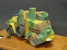 After a sub-layer of gray primer to unify the colors and allow the paint to better stick, a coat of yellow mustard is applied to the entire vehicle. Maskol is then applied where we want to keep the yellow (according to a wavy-edged), then we pass a uniform layer of green, again, Maskol is pllied where you want to keep the green then we pass a last layer of brown. After all these layers, you only have to remove all the maskol to get the three-tone camouflage. The important thing is to start with the lighter tone to go to the darkest. The most important thing in my opinion is to remember that the colors blend visually with each other (a yellow beside a green appears yellow-green, next to a red appears orange), it is therefore essential to add a touch of green and brown to yellow, a touch of yellow and brown to green, and a touch of yellow and green to brown. Of course, the color is darker and less is added and vice versa. This allows a consistency of tone while retaining the difference. The rubber tires are painted in a dark gray color (with a hint of yellow). The patina begins with several oil filters burnt umber and a very light drybrush with the base color lightened to bring out all the rivets. Some streaks are made with a triple zero brush and painting in oil burnt umber, the angles are slightly hung improperly with the same paint, keeping a light hand, finally, raw umber and sienna pigments are applied and fixed with F gasoline.
