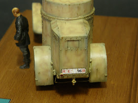 The model first receives a coat of gray primer than a pre-shadowing mixture of mat black and dark brown is sprayed on all hollows and reliefs. The base color is the classic tamiya desert sand thinned with mat white sprayed in very thin layers so as the pre-shading can appear. Thin strips of red brown very dilute are then sprayed in the form of noodles. Then several filters in burnt umber and raw umber, the angles of the vehicle are also treated with a brush and some pigments ended the patina. The plate is made with a color printer.
