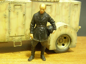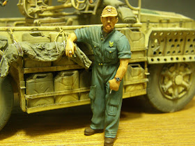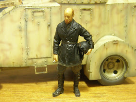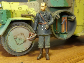 Le conducteur est une figurine en résine d’un tankiste italien légèrement modifié au niveau de l’uniforme, les bras et jambes proviennent d’une figurine dragon. La tête vient d’une pochette hornet. Le casque est un casque allemand modifié pour ressembler à ceux, très particuliers, des conducteurs d’engins blindés de la Reichswehr. La figurine est peinte classiquement à l’acrylique pour l’uniforme et à la peinture à l’huile pour le visage.