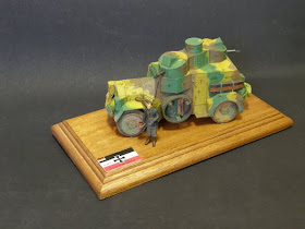 J’ai trouvé plus original de tenter une Daimler de la Reichswehr dans les années trente en livrée trois tons caractéristique de cette époque. C'est sans doute une erreur historique car ces véhicules étant dévolus à la sécurité urbaine, ils ont plus de chance d'être de couleur unie probablement grise, mais bon. Ces trois tons sont les mêmes que la Wehrmacht emploiera plus tard mais avec des nuances différentes. En effet, le jaune sable est un jaune plutôt moutarde, le vert est légèrement plus foncé alors que le brun rouge tire nettement vers le noir (pas assez à mon goût sur mon modèle). Toutes les teintes que j’ai employées sont des références Tamiya. Pour le jaune, j’ai utilisé la référence jaune désert XF59 à laquelle j’ai rajouté une pointe de jaune pur XF3. Pour le vert, j’ai utilisé la référence XF26 avec une pointe de X5. Pour le brun, j’ai utilisé la référence XF64 avec une pointe de noir.