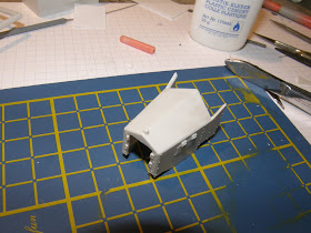 bonsoir à tous, j'ai attaqué la ford Tfc et comme je l'avais entendu dire, il y a du travail surtout au niveau du jointage des différentes pièces mais bon c'est aussi ça le maquettisme, ne pas toujours tomber sur du tamiya qui s'assemble les yeux fermés. Comme souvent avec les anciennes maquettes des pays de l'est, le modèle est décliné en plaques plates qu'il faut ensuite assembler ce qui est un vrai challenge. L'épaisseur des pièces est aussi un problème qu'il faudra prendre en compte, par contre le niveau de détail est correct et les minuscules rivets sont très bien représentés;Il faut séparer en deux le montage entre le chassis d'une part et la superstructure d'autre part. Dans un premier temps je me suis attaqué à la superstructure; j'ai d'abord refait le toit en carte plastique pour cause de mauvais jointage (il manque encore les rivets), avec les trappes d'accès et leur charnières en photodécoupe.