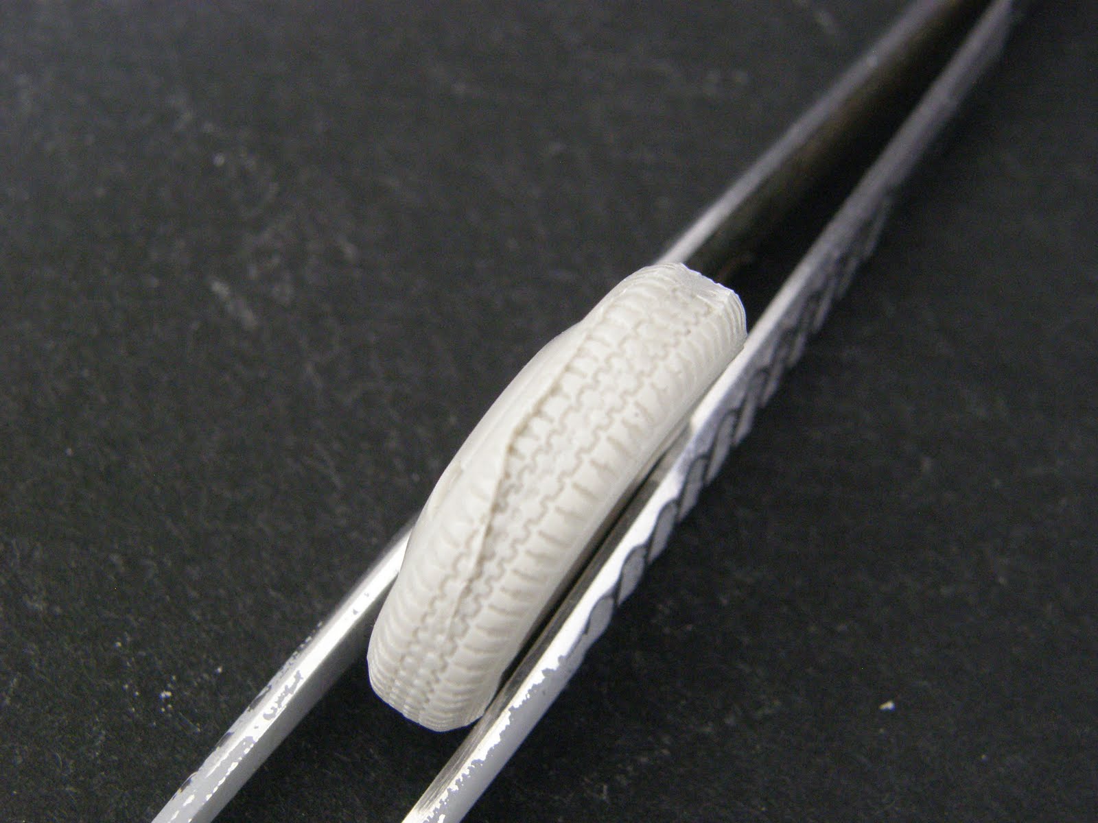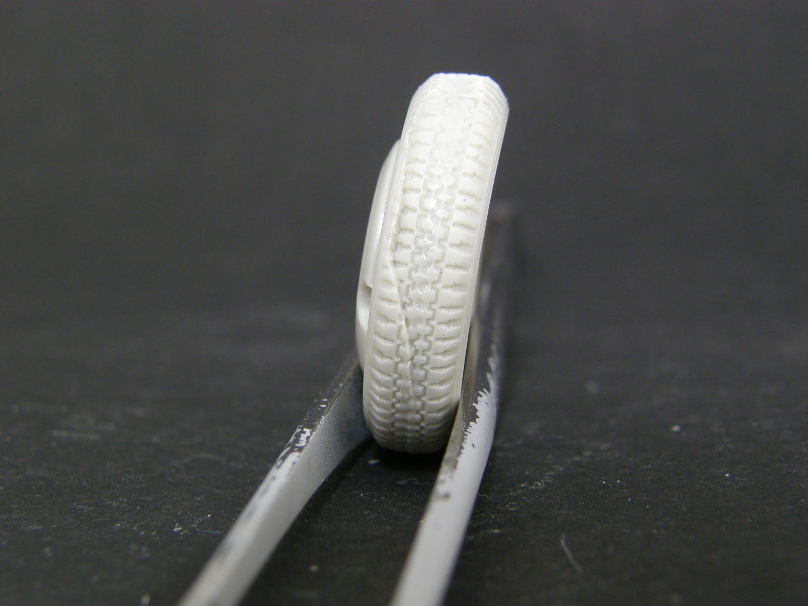 Je voulais ensuite m'attaquer aux roues et là, j'ai eu une bonne et une mauvaise nouvelle. La bonne est que la sculpture est excellente, la mauvaise surprise est qu'il y a parfois (sur trois roues) des décalages de résine qui sont quand même importants, il faudra tenter de rattraper ou de masquer tout ça plus tard.
