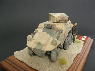 This only indicates that the three-tone camouflage existed. For the green, I think we need to use green-brown described by Mr Ilming it seems logical, so I used the Tamiya XF65 field gray with a drop of red brown Tamiya XF64. For the brown I used Tamiya XF64 with a drop of XF57 buff tamiya not to seem too dark. Finally, for the sand, it seems fairly clear from the pictures, so I used the buff with a drop of green already used. After a coat of primer, the colors were sprayed one after the other starting from the lightest to the darkest and using the dough masking silly putty. Then follow the conventional filters, juice, micropaint, and finally pigments fixed with C gasoline. There is no marking on Austrian vehicles at this period. officer is from the brach models range well known for its quality molding. armored crews wore italian uniforms at this period as shown on photos.