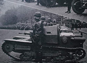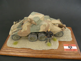 Cela indique seulement que le camouflage trois tons a existé. Pour le vert, je pense qu'il faut se baser sur le vert-brun décrit par Mr Ilming ça parait logique, j'ai donc utilisé du XF65 field grey tamiya avec une pointe de XF64 red brown tamiya. Pour le brun j'ai utilisé du XF64 tamiya avec une pointe de XF57 buff tamiya pour ne pas paraitre trop sombre. Enfin pour le beige, il semble assez clair sur les photos, j'ai donc utilisé du buff avec une pointe du vert déjà utilisé. Après une couche d'apprêt, les couleurs ont été pulvérisées les unes après les autres en partant de la plus claire vers la plus foncée et en utilisant de la pate de masquage silly putty. Puis suivent les classiques filtres, jus, micropeinture et enfin pigments fixés à l'essence C. Il n'y a aucun marquage sur les véhicules autrichiens de cette période. Le personnage vient de la gamme brach models bien connue pour sa qualité de moulage. Les personnels des troupes blindées autrichiennes de cette période portent en effet les uniformes italiens comme vu sur les photos.
