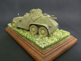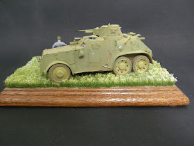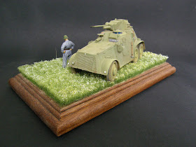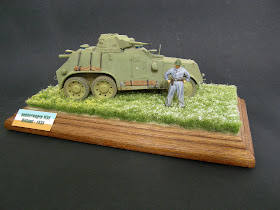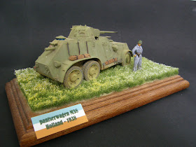 hello friends, after a long absence the Daf M38 is finally over. It was not easy to achieve, but this vehicle is rare and therefore produced by a artisanal firm that I said was correct to send me a full copy because the first one was dotted with bubbles. I planned to add two civilian figures but I guess I'm not good enough to paint with bright colors, I have not managed to get correct rendering for my taste, so I decided to drop them and stick to a single figure. The grass carpet comes from GPP and many clumps were removed a matte varnish was added. The figure is reworked to match the Dutch uniform time (gray work suit): breast pockets are changed, holster and charger are added, the belt is changed, the head is a hornet romanian soldiers ref, the helmet is the model 34 with the rosette in the center.