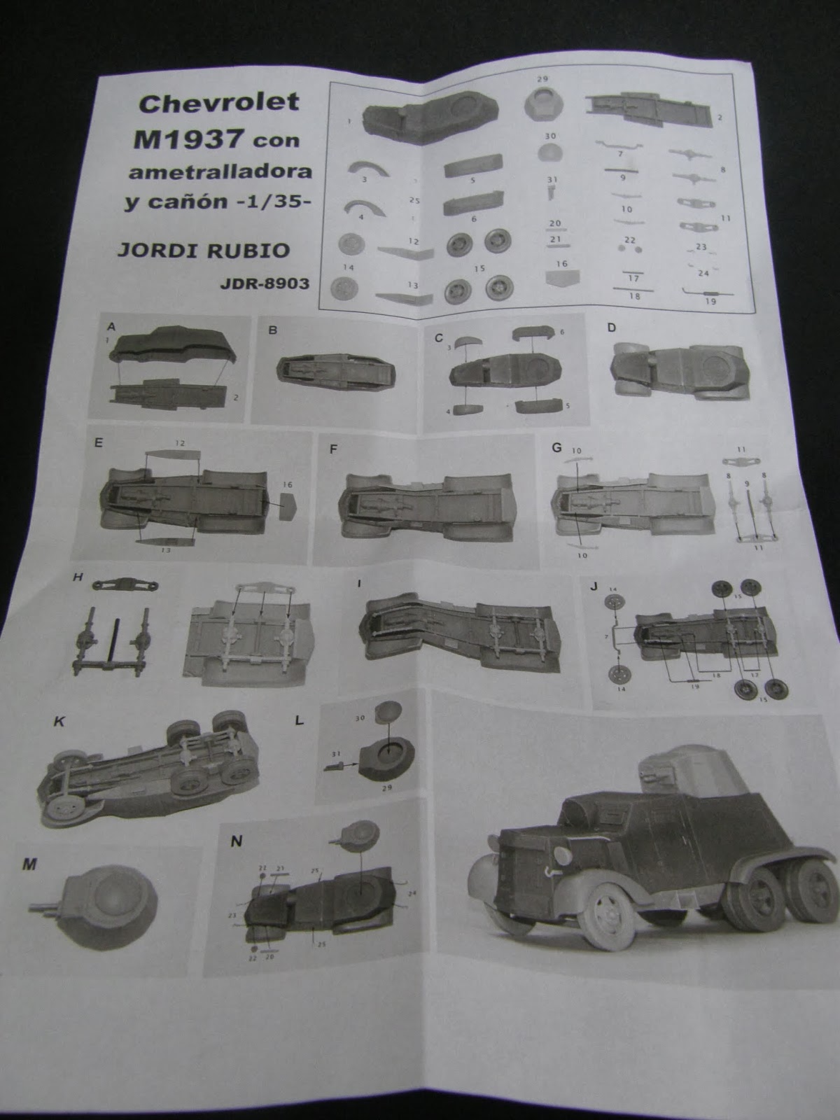 bonsoir à tous, j'ai acquis il y a quelques temps déjà le kit de la chevrolet 1937 produit par jordi rubio , celui-ci propose trois versions de ce véhicule, une avec une seule mitrailleuse en tourelle, une avec la tourelle avec canon de 37 mm et une avec la tourelle russe avec canon de 45 mm. C'est la deuxième version que j'ai choisi, le prix (réf. JDR-8903) à 52,90 € est très raisonnable pour de la résine. Le kit est aussi produit par Blitz , je n'ai pas eu le kit en mains mais la qualité est très correcte d'après l'article superbe de Bruno Berger dans le dernier steelmasters .
