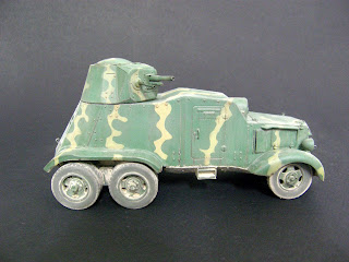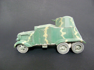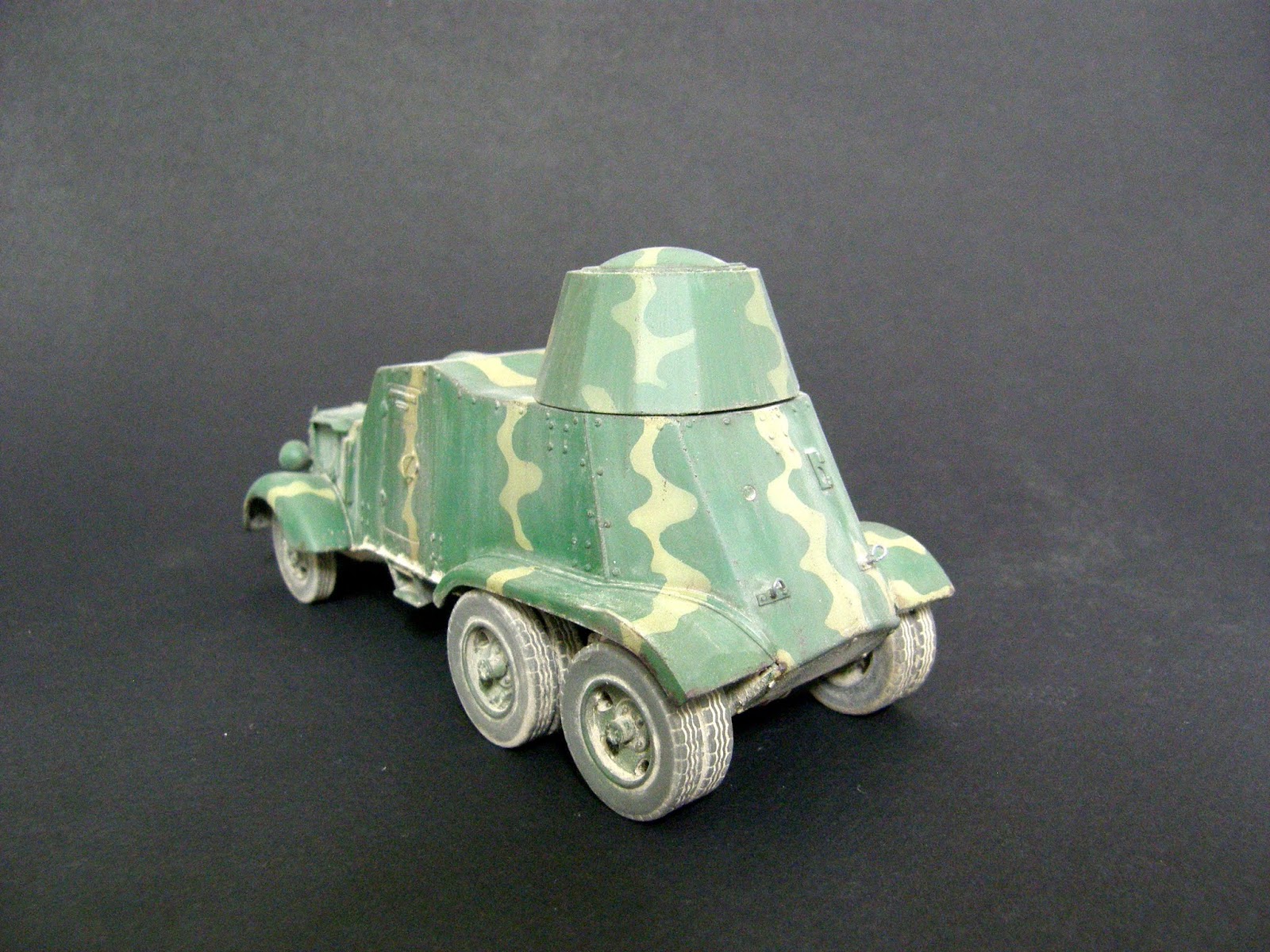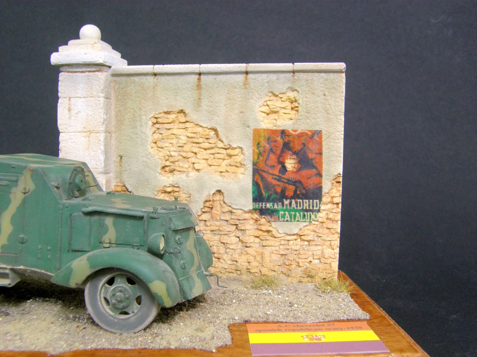 bonsoir à tous, voici la fin pour la chevrolet, elle est mise en scène avec un soldat anglais de chez SKP , la figurine est très correcte et le prix abordable comme la plupart des autres figurines de cette marque que je connaissais peu. La figurine sera modifiée notamment au niveau des poches, l'insigne de poitrine noir à point jaune est rajouté, elle est peinte dans un vert assez délavé qui malheureusement brille encore un peu mais c'est maintenant trop tard pour le retoucher. L'avantage (pour nous) de la guerre civile espagnole est que l'on voit vraiment de tout tant dans les couleurs d'uniforme que de matériel. J'ai eu récemment une discussion avec un artisan espagnol sur les roues de la chevrolet, il était d'avis que c'était les même que la BA6. Mon opinion (sans prétendre aucunement à la vérité) est que cela n'est pas le cas. J'ai essayé tout d'abord les roues de la BA6 (armo et miniart) mais elles sont vraiment minuscules, de plus elles proviennent d'un camion ford à la base, alors que celle de la chevrolet proviennent d'un camion .... chevrolet, si on regarde attentivement les jantes elles semblent les mêmes mais ça n'est pas le cas, les orifices sont triangulaires sur les ford et plus arrondis sur les chevrolet, enfin il suffit de comparer la grosseur et la larger des roues d'une BA et d'une chevrolet sur les photos d'archive pour voir qu'elles sont bien plus grosses, au final j'ai donc gardé les roues fournies par jordi rubio, d'ailleurs si on voit celles de blitz, elles sont à peu près de la même taille. l'affiche provient d'internet et à été imprimée sur du papier à cigarettes puis vernie pour fixer la couleur et ensuite collée sur le mur puis empoussiérée aux pigments.