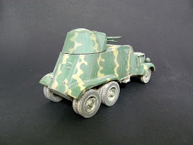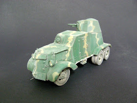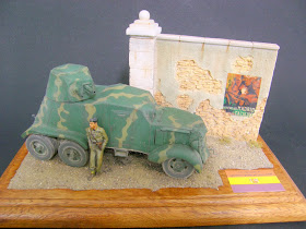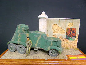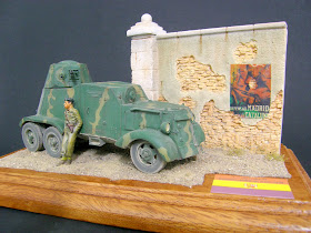 bonsoir à tous, voici la fin pour la chevrolet, elle est mise en scène avec un soldat anglais de chez SKP , la figurine est très correcte et le prix abordable comme la plupart des autres figurines de cette marque que je connaissais peu. La figurine sera modifiée notamment au niveau des poches, l'insigne de poitrine noir à point jaune est rajouté, elle est peinte dans un vert assez délavé qui malheureusement brille encore un peu mais c'est maintenant trop tard pour le retoucher. L'avantage (pour nous) de la guerre civile espagnole est que l'on voit vraiment de tout tant dans les couleurs d'uniforme que de matériel. J'ai eu récemment une discussion avec un artisan espagnol sur les roues de la chevrolet, il était d'avis que c'était les même que la BA6. Mon opinion (sans prétendre aucunement à la vérité) est que cela n'est pas le cas. J'ai essayé tout d'abord les roues de la BA6 (armo et miniart) mais elles sont vraiment minuscules, de plus elles proviennent d'un camion ford à la base, alors que celle de la chevrolet proviennent d'un camion .... chevrolet, si on regarde attentivement les jantes elles semblent les mêmes mais ça n'est pas le cas, les orifices sont triangulaires sur les ford et plus arrondis sur les chevrolet, enfin il suffit de comparer la grosseur et la larger des roues d'une BA et d'une chevrolet sur les photos d'archive pour voir qu'elles sont bien plus grosses, au final j'ai donc gardé les roues fournies par jordi rubio, d'ailleurs si on voit celles de blitz, elles sont à peu près de la même taille. l'affiche provient d'internet et à été imprimée sur du papier à cigarettes puis vernie pour fixer la couleur et ensuite collée sur le mur puis empoussiérée aux pigments.