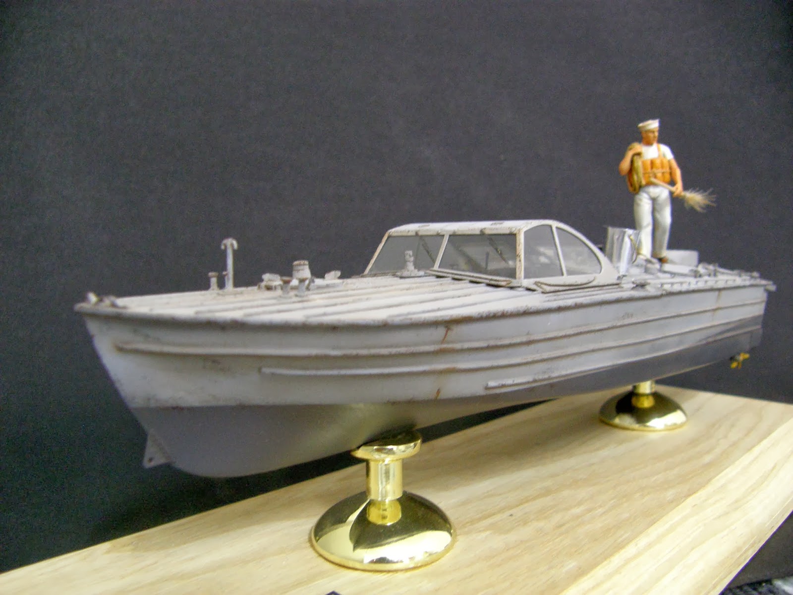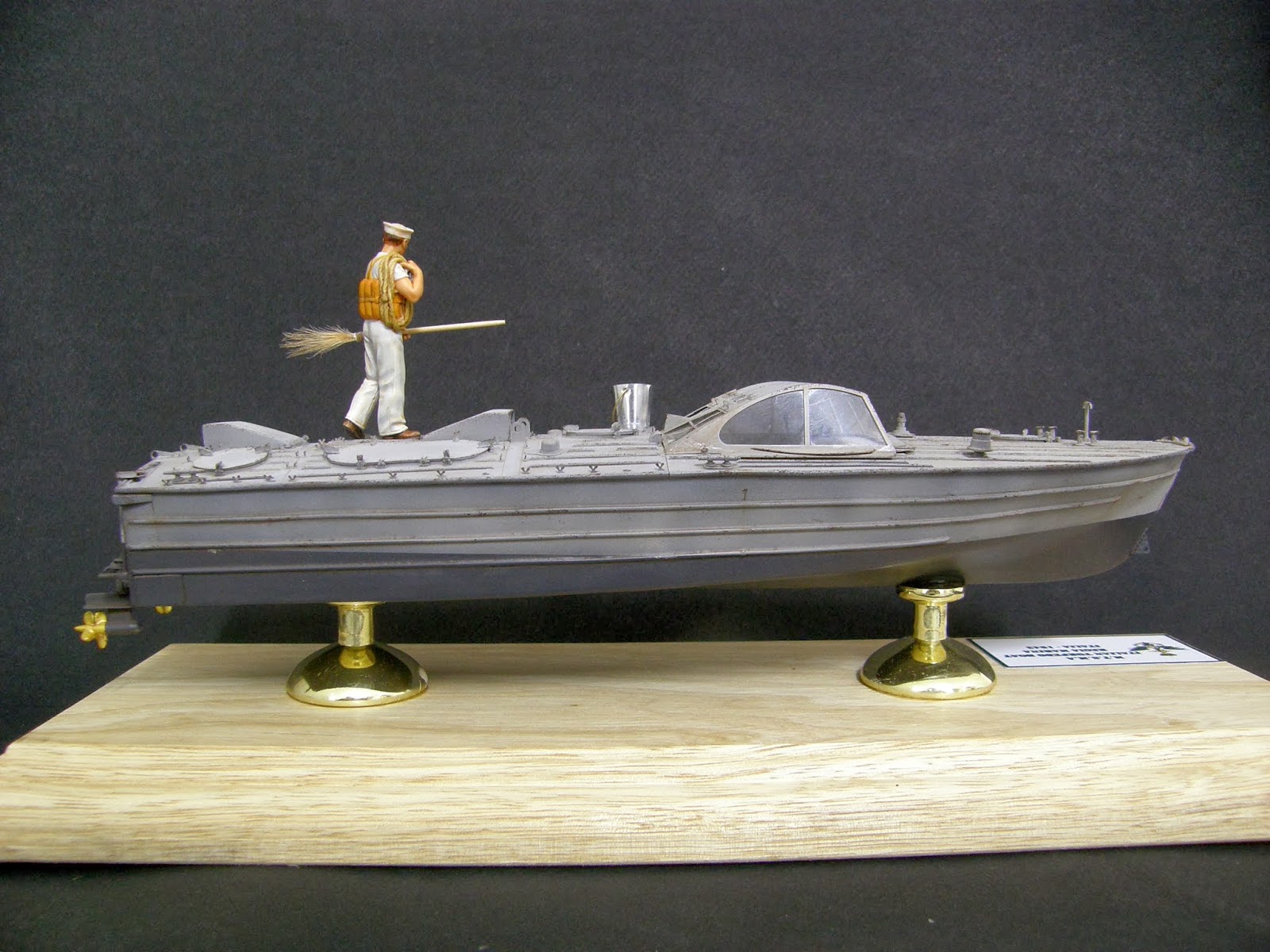 Bonsoir à tous, voila, la vedette MTSMA est finie, ce kit fut un plaisir à construire hormis la cabine en photodécoupe qui m'a donné des sueurs froides..., la peinture reste classique avec un apprêt gris foncé sur l'ensemble puis un gris clair sur la partie supérieure avec un léger (trop léger ?) effet de modulation sur les différentes trappes de visite puis vieillissement classique. La figurine est peinte aux huiles pour les chairs et à l'acrylique pour l'uniforme. Les supports sont des boutons de porte d'un magasin de bricolage.