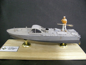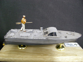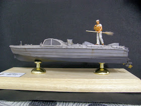 Bonsoir à tous, voila, la vedette MTSMA est finie, ce kit fut un plaisir à construire hormis la cabine en photodécoupe qui m'a donné des sueurs froides..., la peinture reste classique avec un apprêt gris foncé sur l'ensemble puis un gris clair sur la partie supérieure avec un léger (trop léger ?) effet de modulation sur les différentes trappes de visite puis vieillissement classique. La figurine est peinte aux huiles pour les chairs et à l'acrylique pour l'uniforme. Les supports sont des boutons de porte d'un magasin de bricolage.