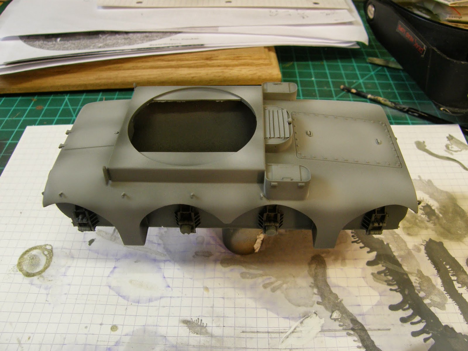 La peinture se fait classiquement, un aprêt de carrosserie gris clair, un mélange de gris panzer tamiya et de blanc progressivement éclairci sur le dessus, des noix de peinture à l'huile blanc, et différentes tonalités de bleu et d'ocre écrasées au pinceau, un filtre raw umber et un empoussiérage aux pigments.